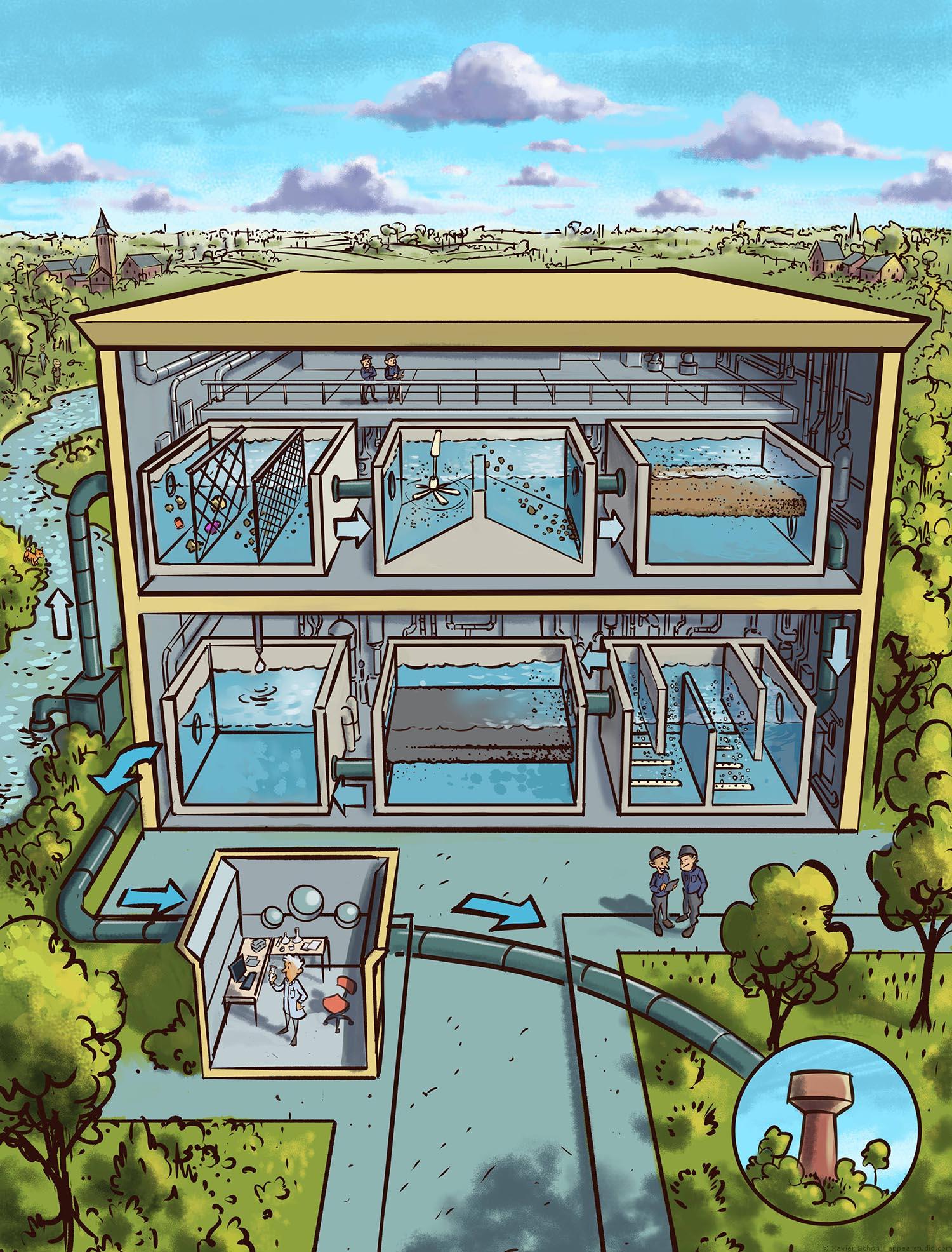 Pour l’exposition Les Gardiens de l’Eau j’ai réalisé une série d’illustrations. Celle-ci montre l’intérieur d’une usine de traitement de l’eau avec toutes les étapes de purification.