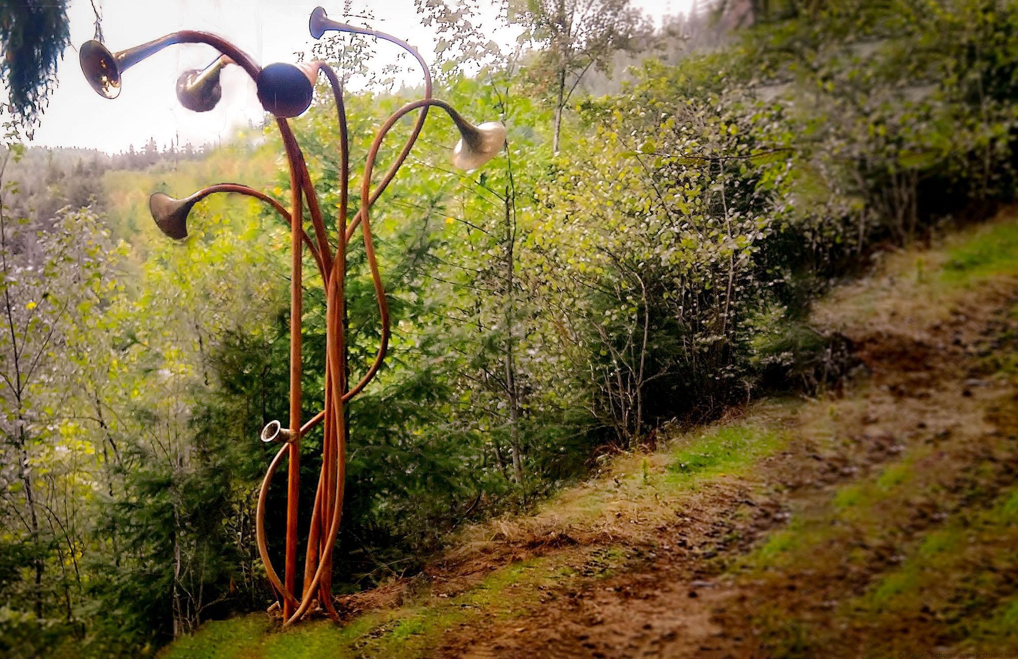 Cette sculpture interactive a été créée pour être installée dans la forêt des expériences de la Cantinière dans le Beaujolais.