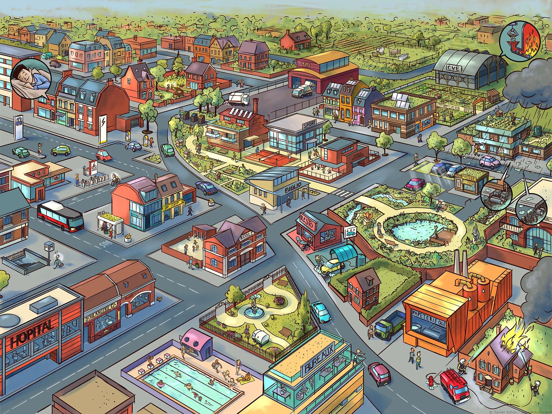 Pour l’exposition Les Gardiens de l’Eau j’ai réalisé une série d’illustrations. Ces deux images montrent une ville avant et après sa transformation écologique. Des dizaines de choses changent: des pistes cyclable et des transports en commun apparaissent, des usines de traitement d’ordures et des éco quartiers sont construits, l’eau est mieux gérée, etc.